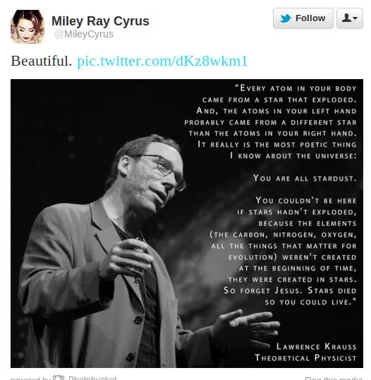 Miley Cyrus & Liam HemsworthWith apps like Twitter, Instagram, Facebook, and SnapChat they have direct access to their favorite celebrities. They know their political views, spiritual views, and even what they ate for dinner! When their favorite celebrity starts talking about their spirituality…they listen. Imagine a young daughter who has grown up with the likes of Hannah Montana as a role model. Hannah has now become Miley Cyrus. Miley not only has all the money in the world, but people worship her. She even gets to date Liam Hemsworth (as well as other men and women)! Do you think that young girls do not grow envious of something like that? Do you think that they do not wonder why Miley can have him and they can’t? What is she doing that they are not? What happens when Miley talks about popping Molly (slang for the drug MDMA or Ecstasy) and says that marijuana is her favorite drug to use? What about when Miley retweeted an image of the galaxy with a quote from atheist Lawrence Krauss that stated “forget Jesus. Stars died so you can live”? Do not think that young kids do not take notice to these things.Miley Cyrus Tweets quote from atheist Lawrence Krauss